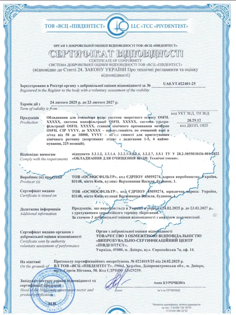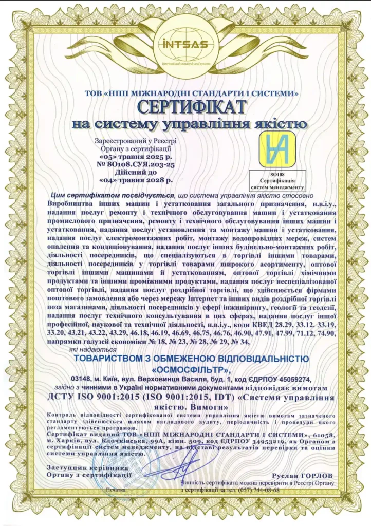 ТОВ «Осмосфільтр». Виготовлення промислових систем зворотного осмосу для очищення води