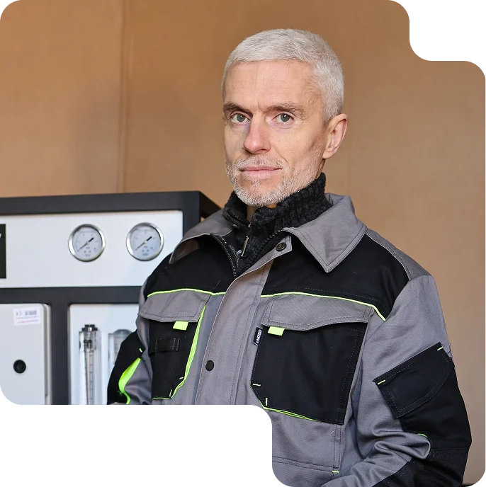 Головний інженер та засновник компанії Юрій Змієвський має науковий ступінь доктора технічних наук у галузі мембранних технологій, що безпосередньо впливає на якість інженерних рішень, коректність підбору обладнання та стабільність результату для замовників.